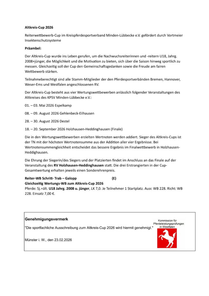 Für jugendliche Reiterinnen und Reiter gibt es einen neuen Cup im Kreispferdesportverband Minden-Lübbecke. Der Altkreis-Cup wurde ins Leben gerufen, um die Nachwuchsreiterinnen und -reitern U18, Jahrg. 2008+jünger, die Möglichkeit und die Motivation zu bieten, sich über die Saison hinweg sportlich zu messen. Gleichzeitig soll der Cup den Gemeinschaftsgedanken sowie die Freude am fairen Wettbewerb stärken. Gefördert wird der Reiterwettbewerb-Cup durch Vortmeier Insektenschutzsysteme.